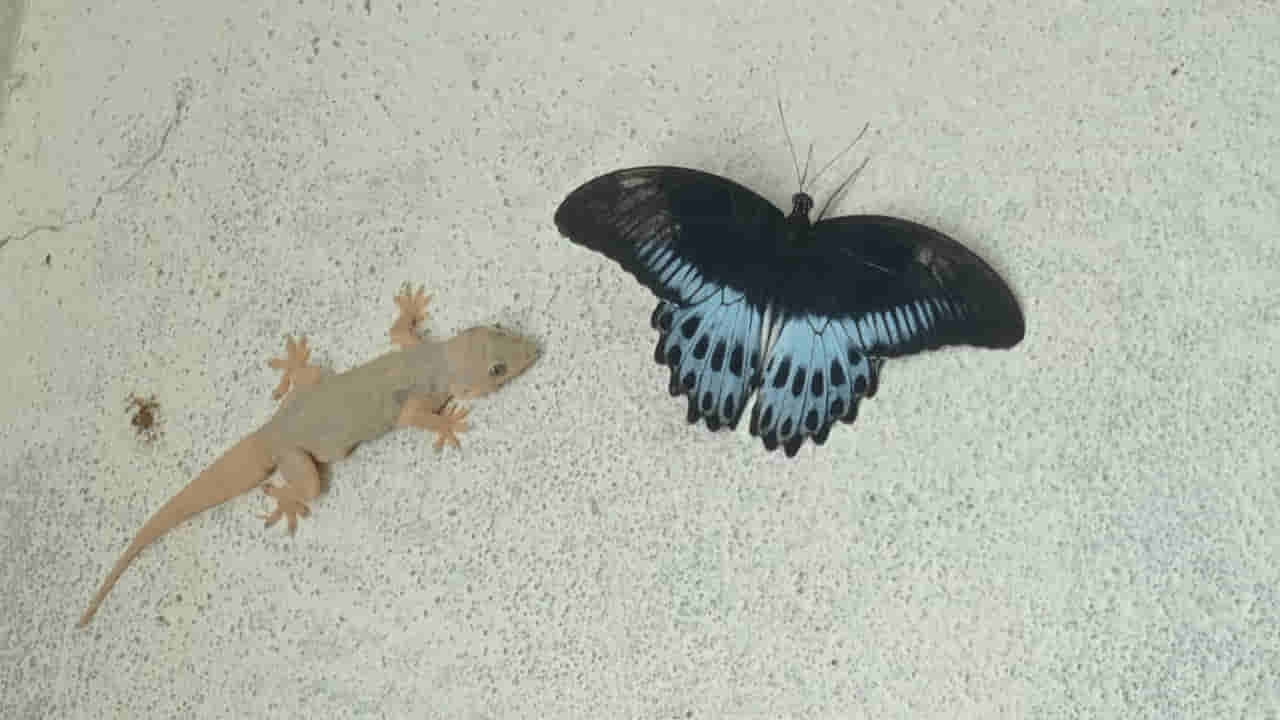 ఏలూరు, సెప్టెంబర్ 5: ఆకలి ప్రతి జీవికి ఉంటుంది. సింహం వేటాడేటపుడు ఆవు సాధు జంతువని, జింక అందంగా ఉందని చూడదు. కేవలం తన ఆహారం కోసం వాటిని చంపి తినేస్తుంది. ఇక సర్పాలు, కప్పలు ఒక దాన్ని మరొకటి వేటాడి తినే ప్రాణులు. ఒక్కో జంతువు వేట ఒక్కో రకంగా ఉంటుంది. బల్లి గోడలపై ఉండి కాంతికి ఆకర్షించబడి వచ్చే పురుగులు తినేస్తుంది. కాని దానికి సైతం ఎంతో నేర్పు ఓర్పు కావాలి. ఇలా ఆహారం కోసం ఆతృతగా ఎదురుచూస్తున్న ఒక బల్లికి, ఆహ్లాదం కోసం వచ్చిన ఒక సీతాకోక చిలుక ఆహారమైంది. సాధారణంగా సీతాకోకచిలుక పొలాలమ్మటి , చెట్లన్నీ ఉండే పువ్వులపై వాలుతూ ఉంటాయి. అప్పుడప్పుడు ఇళ్లల్లో లైటింగ్ ఉన్నప్పుడు వస్తూ ఉంటాయి. వీటిని పట్టుకోవాలంటే కష్టమే. చటుక్కున ఎగిరిపోతాయి.