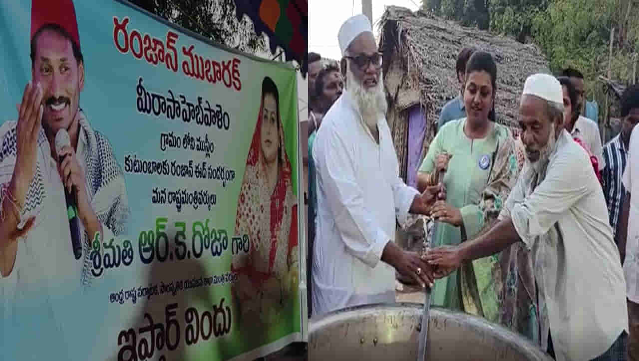 ఇక మీరాసాహెబ్ పాళెం, వేలావడి గ్రామాల్లోని 2,380 కుటుంబాలకు పార్టీ శ్రేణుల ద్వారా విందు, చీరను పంపిణీ చేశారు. ఈ సందర్భంగా రోజా స్వయంగా గరెట పట్టడం విశేషం. ఇఫ్తార్ విందు ప్రారంభానికంటే ముందుగానే గ్రామానికి చేరుకున్న రోజా అన్ని పనులు దగ్గరుండి చూసుకున్నారు. అనంతరం ముస్లింలకు కానుకలు అందజేశారు. కాగా గతంలో ఎన్నికల సమయంలో మీరాసాహెబ్ పాళెంలో పర్యటించిన రోజా గ్రామాన్ని దత్తత తీసుకుంటానని మాటిచ్చారు. అనంతరం అధికారికంలోకి వచ్చిన వెంటనే ఇచ్చిన మాట మేరకు గ్రామాన్ని దత్తత తీసుకున్న రోజా.. పలు అభివృద్ధి పనులు చేయించారు.