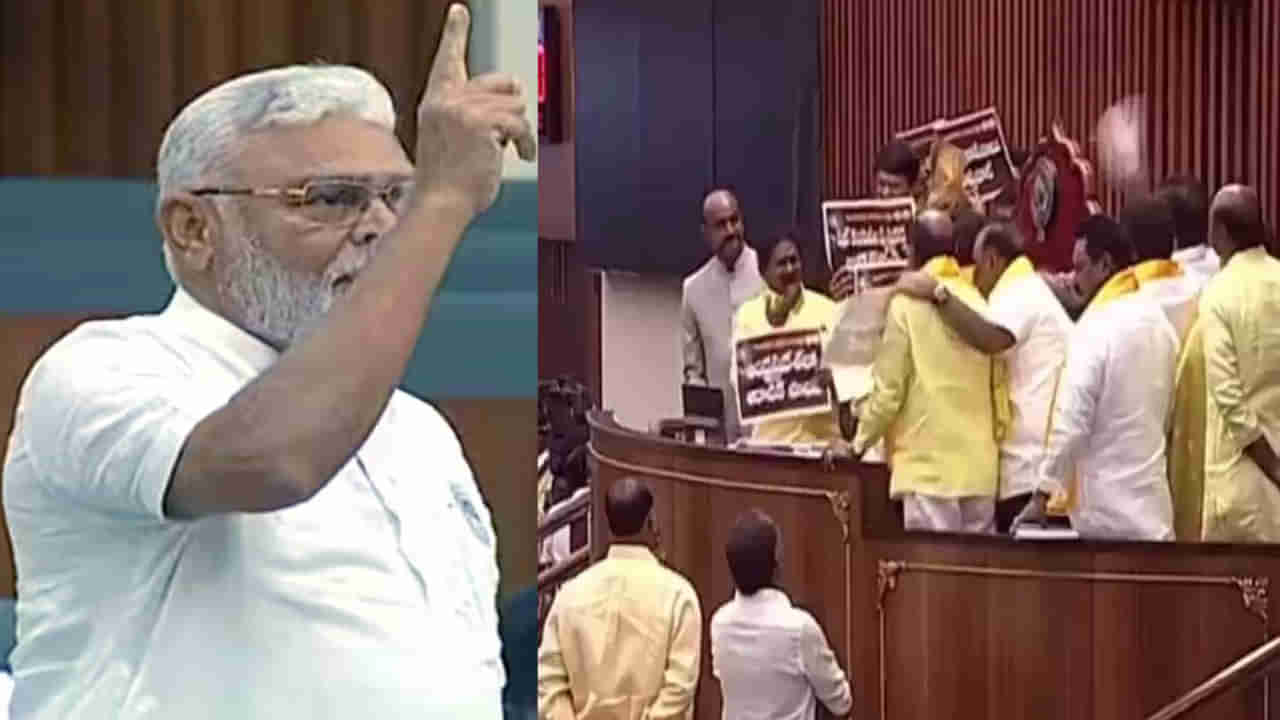 సమయం 9:32గంటలు.. టీడీపీ సభ్యులు ఏమాత్రం తగ్గేలేదు. తమ ఆందోళను కంటిన్యూ చేస్తూ స్పీకర్ చుట్టూ నిలబడి ప్లకార్డులు ప్రదర్శిస్తూ.. చంద్రబాబుపై పెట్టిన అక్రమ కేసులు వెంటనే ఎత్తివేయాలని డిమాండ్ చేశారు. ఇంతలో వైసీపీ నుంచి టీడీపీలోకి వచ్చిన నెల్లూరుకు చెందిన ఎమ్మెల్యే కోటంరెడ్డి స్పీకర్ మానిటర్ను డ్యామేజ్ చేస్తున్నట్లు.. టీడీపీ సభ్యులు బల్లలు చరుస్తూ.. సభను అవమానిస్తున్నారంటూ మంత్రి అంబటి రాంబాబు చెప్పే ప్రయత్నం చేస్తూ.. టీడీపీ సభ్యులకు మరోసారి తిరగ మోతపెట్టారు.