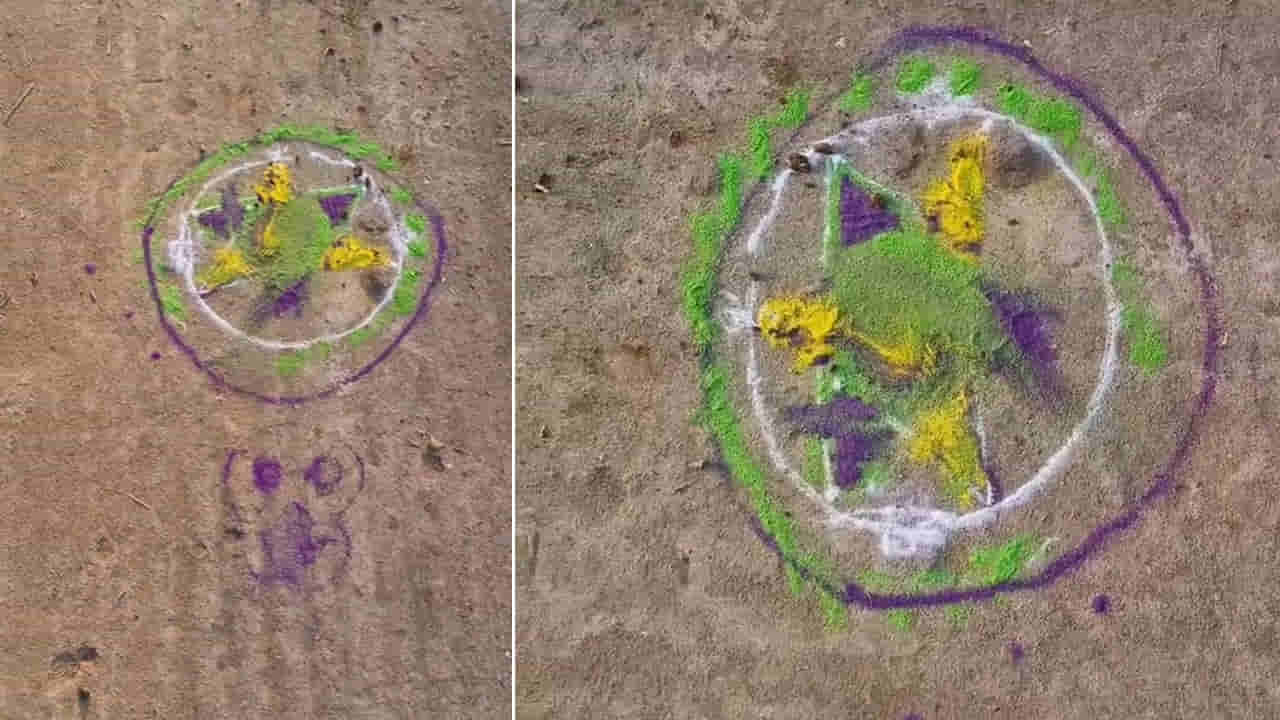 శ్రీకాకుళం జిల్లా కవిటి మండలం డెప్పిలి గోనపపుట్టుగ గ్రామంలో క్షుద్రపూజలు కలకలం రేపాయి. గ్రామంలోని చెల్లెమ్మ చెరువు మీదుగా నీలాపుపుట్టుగ గ్రామానికి వెళ్లే దారిలో గుర్తు తెలియని వ్యక్తులు క్షుద్ర పూజలు చేశారు. రహదారి మధ్యలో పిండితో పుర్రె బొమ్మ వేసి, ముగ్గు వేసి ఉంది. ముగ్గు మధ్యలో వరిగడ్డితో చేసిన బొమ్మ, వేపకొమ్మలు పెట్టారు. సినిమాల్లో చూపించేలా ముగ్గు మధ్యలో పెట్టిన గడ్డితో చేసిన బొమ్మకు వస్త్రం కూడా చుట్టారు. ముగ్గుకి ఇరువైపుల కూర్చొని పూజలు చేసినట్టుగా రెండు వైపుల బొంత, చాప పరిచి ఉన్న ఆనవాళ్లు ఉన్నాయి. గత 2 రోజుల నుంచి రాత్రిపూట ఇలా జరుగుతున్నట్లు గ్రామస్తులు గుర్తించారు. దీంతో గ్రామస్తులు తీవ్ర భయాందోళనలు చెందుతున్నారు. తమ ఊరులో గతంలో ఎప్పుడు ఇలాంటివి జరగలేదని గ్రామస్తులు అంటున్నారు.