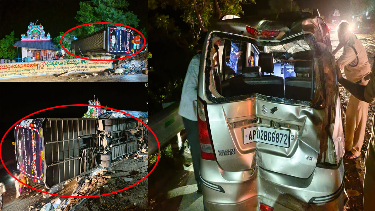 జగన్ ట్రావెల్స్ కు సంబంధించిన బస్సు ఘాట్లో మూడవ టర్నింగ్ వద్ద గల ఆంజనేయ స్వామి గుడి వద్దకు వచ్చేసరికి బ్రేక్ ఫెయిల్ అయింది. దీంతో ముందువైపు పోతున్న కారును వేగంగా గుద్దింది. డ్రైవరు చాకచక్యంగా బస్సును టెంపుల్ గోడ వైపుకు మళ్ళించగా ఆంజనేయస్వామి, వినాయక స్వామి గుడి మధ్యలో గల సందులోకి పోయింది. దీంతో బస్సు గుడి గోడపై బోల్తా పడి.. అక్కడే నిలిచిపోయింది. బస్సు, కారులోని ప్రయాణికులకు ఎలాంటి ప్రాణ నష్టం జరగలేదు. బస్సు డ్రైవర్తోపాటు పలువురి స్వల్ప గాయాలైనాయి. ఎలాంటి ప్రాణ నష్టము జరగపోవడంతో అంతా ఊపిరి పీల్చుకున్నారు. సంఘటన సమయంలో బస్సులో 33 మంది ప్రయాణికులు ఉన్నారు. ప్రమాదం ధాటికి బస్సు ఢీ కొట్టిన కారు వెనుక భాగం పూర్తిగా పాడైంది. ఇందుకు సంబంధించిన పూర్తి వివరాలు తెలియాల్సి ఉంది.