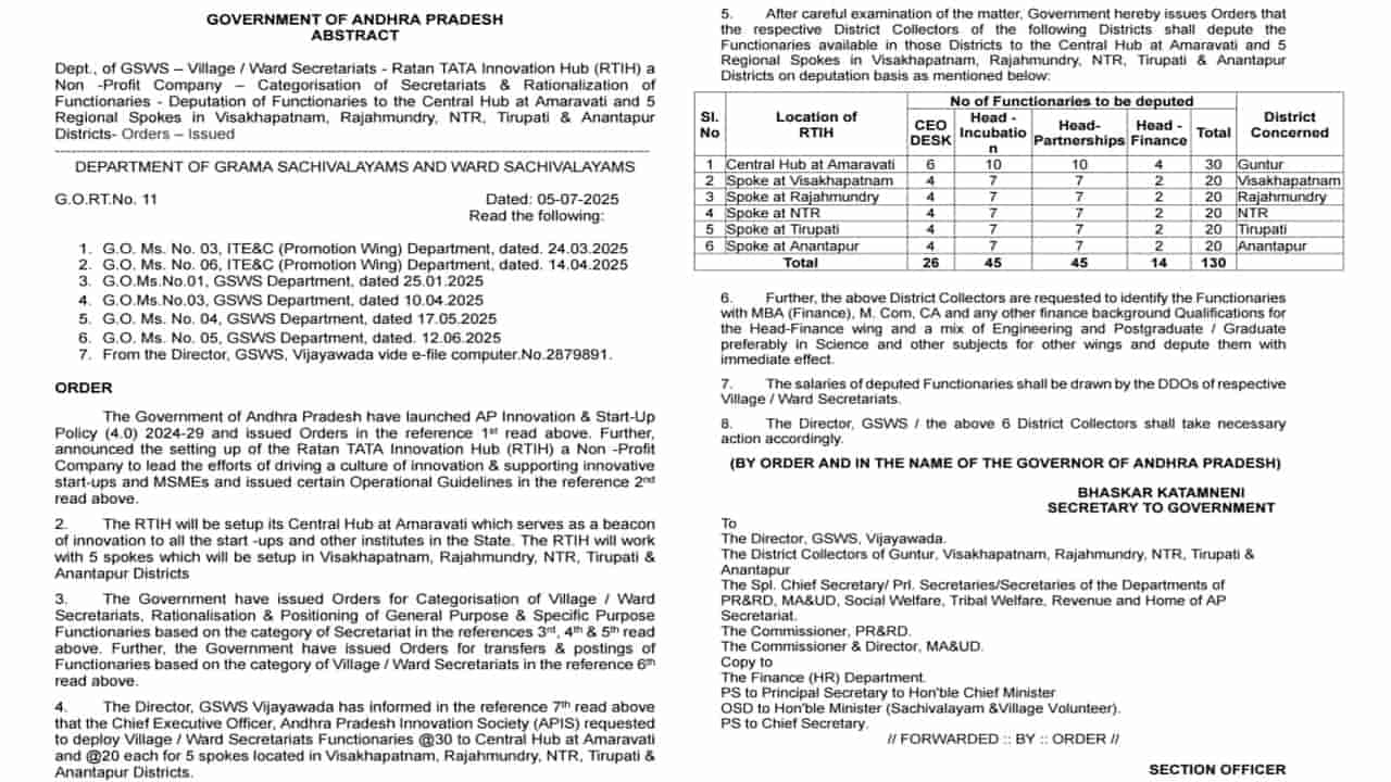 ఆంధ్రప్రదేశ్ కొత్త రాజధాని అమరావతిని నూతన ఆవిష్కరణలకు వేదికగా తీర్చిదిద్దేందుకు సీఎం చంద్రబాబు కృషి చేస్తున్నారు. ఇందులో భాగంగానే అమరావతిలో రతన్ టాటా ఇన్నోవేషన్ హబ్ (ఆర్టీఐహెచ్)ను త్వరలో ప్రారంభించనున్నారు. పారిశ్రామిక దిగ్గజ సంస్థలు టాటా గ్రూప్, ఎల్ అండ్ టి వంటి అనేక సంస్థలను ఒకే వేదిక మీదకు చేర్చి ఆర్టీఐహెచ్ను సమర్థవంతంగా నిర్వహించేలా కార్యాచరణ రూపొందించారు. ఐదేళ్లలో 20,000 స్టార్ట్ప్లతో 1000 కోట్ల పెట్టుబడి, 1 లక్ష ఉద్యోగాలు కల్పించాలనే లక్ష్యంతో ముందుకు వెళ్తున్నారు. అందులో భాగంగానే అమరావతి కేంద్రంగా ఏర్పాటయ్యే సెంట్రల్ హబ్కు గ్రామ, వార్డు సచివాలయ ఉద్యోగులను కేటాయించాలని సీఎం చంద్రబాబు ఆదేశాలు జారీ చేశారు. ఈ మేరకు మొత్తం అమరావతితో పాటు ఐదు జిల్లాల పరిధిలో ఉండే గ్రామ/వార్డు సచివాలయాల ఉద్యోగులను ఈ ఇన్నోవేషన్ హబ్ కు కేటాయించేలని ఆయా జిల్లా కలెక్టర్లకు ఆదేశాలు జారీ అయ్యాయి.