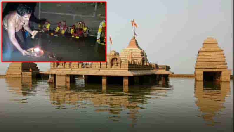 Flood flow to Sangameswara Temple: సప్తనదీ సంగమేశ్వరం వద్ద కృష్ణమ్మ పరవళ్లు తొక్కుతోంది. ఎగువన కురుస్తున్న భారీ వర్షాలకు జూరాల ప్రాజెక్టు నుంచి భారీగా వరద నీరు వచ్చి చేరుతోంది. దీంతో సంగమతీరం సంద్రాన్ని తలపిస్తోంది. వారం రోజులుగా వరద పోటెత్తడంతో సంగమేశ్వరం వద్ద ప్రకృతి అందాలను వీక్షించేందుకు పర్యాటకులు క్యూ కడుతున్నారు. సంగమేశ్వరాలయం జలాధివాసం కావడంతో భక్తులు ఎగువన ఉన్న ఉమామహేశ్వర స్వామి ఆలయంలో పూజలు చేస్తున్నారు. అర్చకులు అంత్య పూజలు నిర్వహించారు. వరద జలాలు ఆలయంలోకి చేరుకోవడంతో ఆందోళన వ్యక్తమవుతోంది.