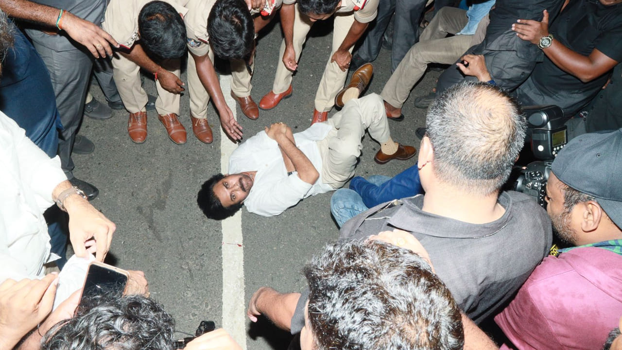 Pawan Kalyan: జనసేన పార్టీ అధినేత పవన్ కల్యాణ్ విజయవాడకు రావడానికి చేసిన ప్రయత్నాలు ఉద్రిక్తతలకు దారి తీశాయి. అర్ధరాత్రి హైడ్రామా నడిచింది. పోలీసుల వైఖరికి నిరసనగా పవన్ రోడ్డుపై పడుకొని నిరసన తెలపడంతో హైటెన్షన్ నెలకొంది. పోలీసుల తీరుపై తీవ్ర అసహనం వ్యక్తం చేసిన పవన్.. ఆంధ్రప్రదేశ్లోకి వచ్చేందుకు వీసా, పాస్పోర్టు కావాలా అని ప్రశ్నించారు.