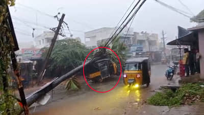 శ్రీకాకుళం జిల్లాలో గాలి, వాన బీభత్సం సృష్టించగా రణస్థలం వద్ద పెద్ద ప్రమాదం తప్పింది. రామతీర్థం కూడలి వైపు వెళ్తున్న ఆటోపై భారీ తాటి చెట్టు అకస్మాత్తుగా పడింది. అదృష్టవశాత్తు ఆ సమయంలో ఆటోలో ప్రయాణికులు లేకపోవడంతో ప్రాణనష్టం తప్పింది. ఆటో డ్రైవర్ స్వల్ప గాయాలతో బయటపడగా, విద్యుత్ వైర్లు దెబ్బతినడంతో వెంటనే విద్యుత్ సరఫరా నిలిపివేశారు.