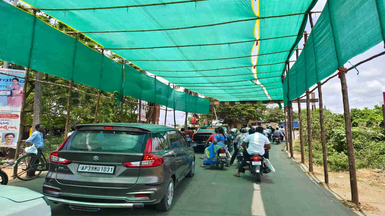 సీతా రాముల కళ్యాణం చేసే సందర్భంలో ఊరంతా పందిరి, ముత్యాల తలంబ్రాలు అనే మాటలూ మనం వింటూనే ఉంటాము. ఇప్పుడెందుకు వీటి గురించి అనుకుంటున్నారా.. ఈ ఎండా కాలంలో మీరు ఒక్కసారి ఆంధ్రా లాస్ వెగాస్గా పిలువబడే భీమవరం వెలితే..మనను ఆ మాట గుర్తొస్తుంది. భీమవరంలో ఎంట్రీ నుంచి ఎండింగ్ దాకా.. మనకు గ్రీన్ మ్యాట్లతో వేసిన పందిళ్లు కనిపిస్తుంటాయి. ఇవి భోజనాలు పెట్టడానికో.. ఫంక్షన్ల కోసమో వేసినవి కాదు. ఈ సీజన్లో ఎండలు వేడిని తట్టుకోలేక రైల్వే లైన్ క్రాసింగ్ దగ్గర నిమిషాలు కొద్ది నిలబడలేక ఇలాంటి గ్రీన్ మ్యాట్ పందిళ్లు వేశారు అధికారులు