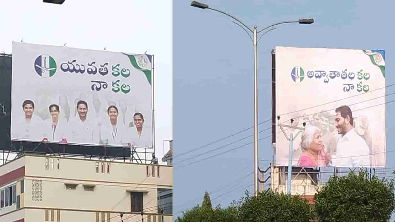 నాకు ఒక కల ఉంది” పేరుతో కొత్త నినాదాన్ని వైసీపీ సిద్ధం చేసింది. రాష్ట్రంలో ఇప్పటి వరకు జగన్ ఫోటోతో సిద్ధం ఫ్లెక్సీలు చూశాం, దానికి సమాధానం చెబుతు సీఎం జగన్ కార్యకర్తల కోసం సిద్ధం సభలు నిర్వహించారు .వచ్చే ఆదివారం అద్దంకిలో జరగనున్న సిద్ధం సభ చివరిది కావడంతో ఇకపై ఎపిలో సిద్ధం పోస్టర్లు కనిపించవు. అందుకు ప్రత్యామ్నాయంగా వైసీపీ మరో నినాదంలో ప్రజల్లోకి వస్తోంది. నాకు ఒక కల ఉంది పేరుతో రాష్ట్రంలోని ప్రతి నగరం ప్రతి వాడలో కార్మికులతో, పిల్లలతో, అవ్వతాతలతో, అక్కచెల్లమ్మలతో, రైతులతో జగన్ ఉన్న ఫోటోతో మీ కల నా కల అంటూ ప్రత్యక్షం అయ్యాయి. దీంతో ప్రజల కలే తన కలగా చెబుతూ అవి నేరవేర్చే దిశగా అడుగులు వేస్తానంటూ సీఎం జగన్ తన ఎన్నికల ప్రచారం ప్రారంభించారు. ఈ మొత్తం మీ కల నా కల ప్రచారంలో మొత్తం 6 వర్గాల ప్రజలకు చెందిన హోర్డింగ్ లు ఉన్మాయి. వైసీపీ ఏర్పాటు చేసిన హార్డింగ్లలో రైతుల కల – జగనన్న కల, యువత కల జగనన్న కల, అక్కా చెల్లెమ్మల కల జగనన్న కల, అవ్వా తాతల కల జగనన్న, కార్మికుల కల జగనన్న కల అంటూ హోర్డింగ్లను వైసీపీ ఏర్పాటు చేసింది.