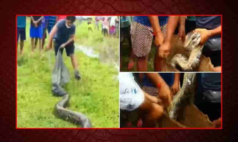 పైతాన్.. తెలుగులో కొండ చిలువ అంటాం. ఈ కొండ చిలువలకు కాటేయడానకి కోరలు ఉండవు కానీ.. ఏకంగా ప్రాణులను అమాంతం మింగేస్తాయి. మేకల్ని, దూడల్ని, దుప్పులను ఇలా కనిపంచే ప్రతి పశువులను ఇవి మింగేస్తాయి. తొలుత ఆ జీవుల్ని మొత్తం చుట్టేసి.. ఊపిరి ఆడకుండా చుట్టుకుని చంపేస్తాయి. ఆ తర్వాత వాటిని మింగేస్తాయి. ఇలాంటి కొండ చిలువల్లో బర్మా కొండచిలువలు కాస్త ఎక్కువ ప్రమాదకరం. అయితే ఇలాంటి బర్మా కొండచిలువ ఒకటి అసోం రాష్ట్రంలో ప్రత్యక్షమైంది. రాష్ట్రంలోని నాగోన్ జిల్లాలోని చపనాల ప్రాంతంలో జనావాసాల మధ్య బర్మీస్ కొండచిలువ కన్పించింది. దీంతో స్థానిక ప్రజలు వెంటనే అటవీ శాఖ అధికారులకు తెలిపారు. దీంతో వెంటనే సంఘటనాస్థలికి చేరుకుని ఆ కొండచిలువను పట్టుకున్నారు. ఆ తర్వాత దానిని స్థానిక అటవీ ప్రాంతంలో వదిలేశారు. దీని పొడవు దాదాపు పదిహేను అడుగులు ఉందని ఫారెస్ట్ డిపార్ట్మెంట్ అధికారులు తెలిపారు.