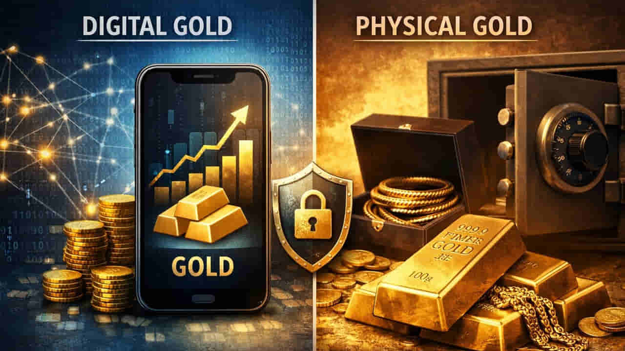 Digital Gold vs Physical Gold: బంగారం కొనుగోలు అనేది కేవలం అలంకారం కోసం మాత్రమే కాదు, ఒక సురక్షితమైన పెట్టుబడిగా కూడా భారతీయులు భావిస్తారు. అయితే, మారుతున్న కాలంతో పాటు బంగారం కొనే పద్ధతులు కూడా మారాయి. ప్రస్తుతం చాలామంది మొబైల్ యాప్ల ద్వారా ‘డిజిటల్ గోల్డ్’ కొనుగోలు చేస్తున్నారు. మరి సంప్రదాయ పద్ధతిలో ఫిజికల్ గోల్డ్ (నగలు, నాణేలు) కొనడం మేలా? లేక డిజిటల్ గోల్డ్ మేలా? ఏది ఎక్కువ సురక్షితం? అనేది తెలుసుకుందాం..