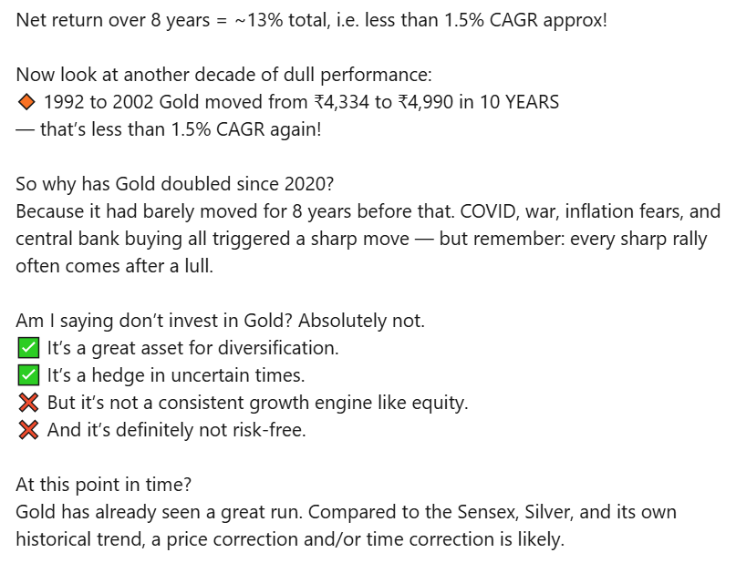 తన పోస్ట్లో బంగారం పెట్టుబడి పోర్ట్ఫోలియోలో ముఖ్యమైన పాత్ర పోషిస్తుందని అన్నారు. కానీ దానిని ఈక్విటీ లాగా స్థిరమైన రాబడిని ఇచ్చే ఆస్తిగా పరిగణించడం పొరపాటు. అందుకే మీ పోర్ట్ఫోలియోలో 5% నుండి 12% మాత్రమే బంగారంలో పెట్టుబడి పెట్టడం తెలివైన పని.