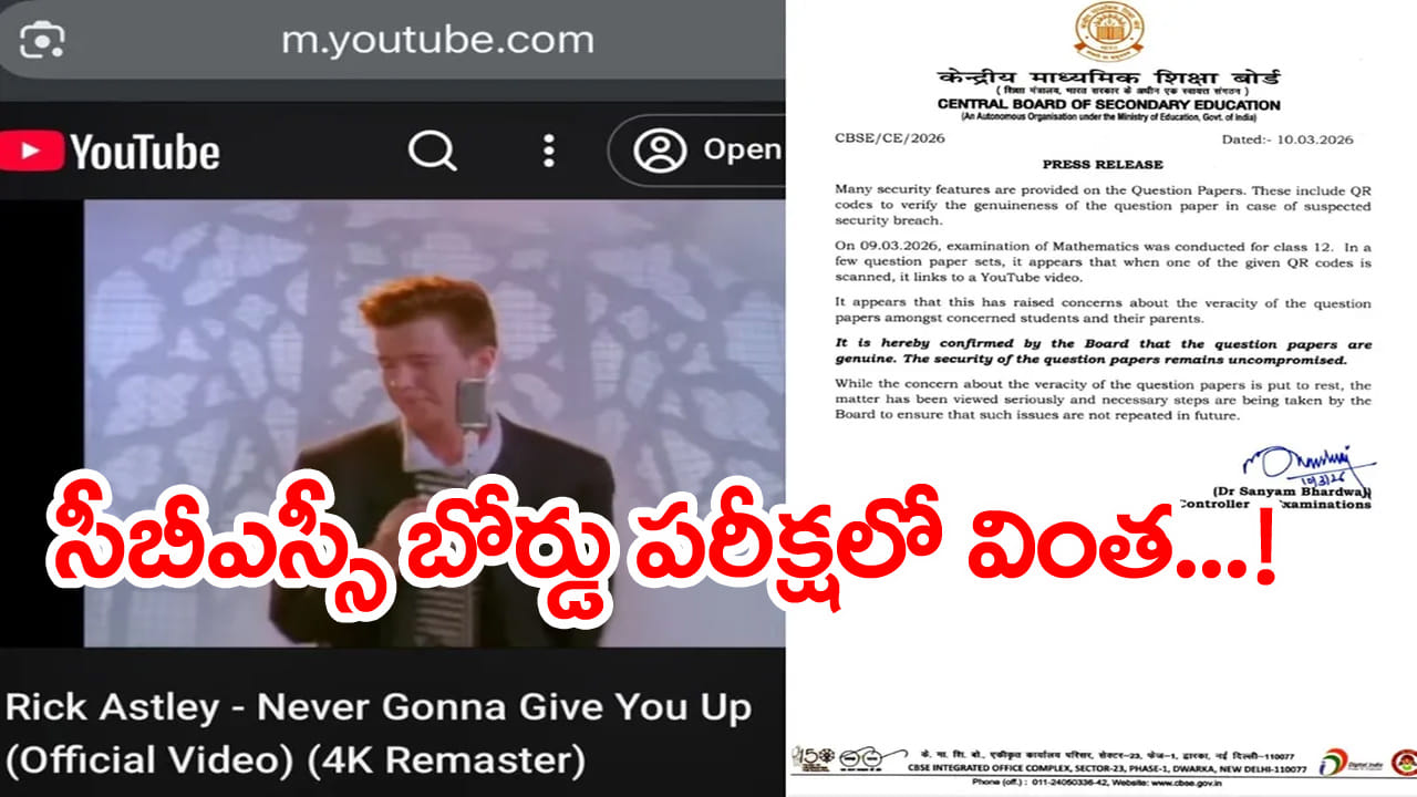 న్యూఢిల్లీ, మార్చి 11: సెంట్రల్ బోర్డ్ ఆఫ్ సెకండరీ ఎడ్యుకేషన్ (CBSE) 12వ తరగతి మ్యాథమెటిక్స్‌ పరీక్షా పత్రం ప్రస్తుతం దేశ వ్యాప్తంగా హల్‌చల్ చేస్తుంది. లక్షలాది మంది విద్యార్ధులు రాసే బోర్డు పరీక్షల క్వశ్చన్‌ పేపర్‌లో జరిగిన వింత ఘటన నెట్టింట వైరల్‌గా మారింది. సాధారణంగా సీబీఎస్సీ బోర్డు పరీక్షల అన్ని ప్రశ్నాపత్రాలపై QR కోడ్ ముద్రిస్తారు. సీబీఎస్సీ ప్రశ్నాపత్రాలపై ముద్రించే ఈ క్యూఆర్‌ కోడ్‌ను స్కాన్ చేస్తే సెట్ వెరిఫికేషన్, డిజిటల్ భద్రత కోసం ముద్రిస్తారు. అయితే మార్చి 9న జరిగిన 12వ తరగతి మ్యాథమెటిక్స్‌ పరీక్ష నిర్వహించిన కొద్దిసేపటికే ప్రశ్నపత్రం స్క్రీన్‌షాట్‌లు సోషల్ మీడియాలో వైరల్‌గా మారింది. అందుకు కారణం.. ఈ క్వశ్చన్‌ ముద్రించిన QR కోడ్‌ను స్కాన్ చేస్తే నేరుగా యూట్యూబ్‌ సాంగ్‌ ఓపెన్‌ అవుతుంది. ఇందులో 1987 నాటి రిక్ ఆస్ట్లీ హిట్ సాంగ్ ‘Never Gonna Give You Up’ ప్లే అవ్వడంతో విద్యార్ధులంతా అవాక్కవుతున్నారు. దీంతో విద్యార్థులు స్క్రీన్‌షాట్‌లు తీసి రకరకాల మీమ్స్‌తో సోషల్ మీడియాలో పోస్టులు పెడుతున్నారు