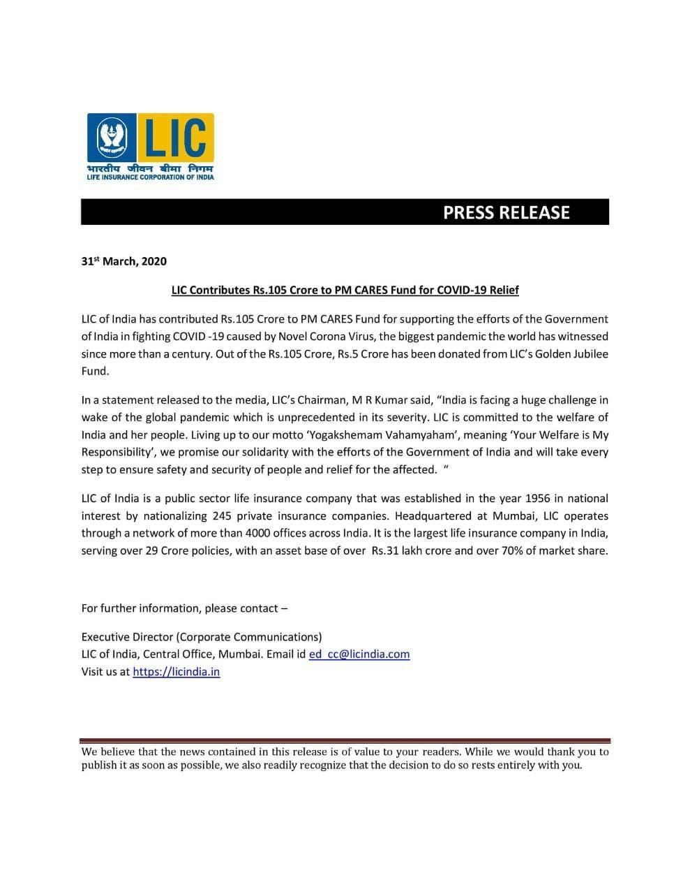 ప్రస్తుతం ప్రపంచ దేశాలన్నీ కరోనా మహమ్మారితో వణికిపోతున్న విషయం తెలిసింది. తాజాగా ఈ మహమ్మారి గత నెల రోజుల నుంచి మన దేశంలో కూడా విళయ తాండవం చేస్తోంది. ఈ క్రమంలో కేంద్ర ప్రభుత్వం ఈ వైరస్ వ్యాప్తిని అరికట్టేందుకు దేశ వ్యాప్తంగా లాక్డౌన్ విధించిన విషయం తెలిసిందే. ఈ క్రమంలో కేంద్ర, రాష్ట్ర ప్రభుత్వాలకు సహాయం అందించాలని.. ప్రధాని మంత్రి కేర్ ఫండ్ కు విరాళాలంద జేయాలని ప్రధని మోదీ సూచించారు. ఈ నేపథ్యంలో అనేక మంది వారి వారి స్థాయికి తగ్గట్లుగా విరాళాలు పంపిస్తున్నారు. కార్పోరేట్ సంస్థలతో పాటు.. పెద్ద పెద్ద కంపెనీలు కూడా ప్రధాని మోదీ కేర్ ఫండ్కు భారీ విరాళాలను అందజేస్తున్నాయి. ఈ క్రమంలో దేశంలోనే అతిపెద్ద బీమా సంస్థ లైఫ్ ఇన్యూరెన్స్ కార్పోరేషన్ (ఎల్ఐసీ) కూడా పీఎం కేర్ ఫండ్కు రూ.105 కోట్ల విరాళాన్ని అందజేసింది. ఇందులో రూ.5 కోట్లు ఎల్ఐసీ గోల్డెన్ జుబ్లీ ఫండ్గా పేర్కొంది.