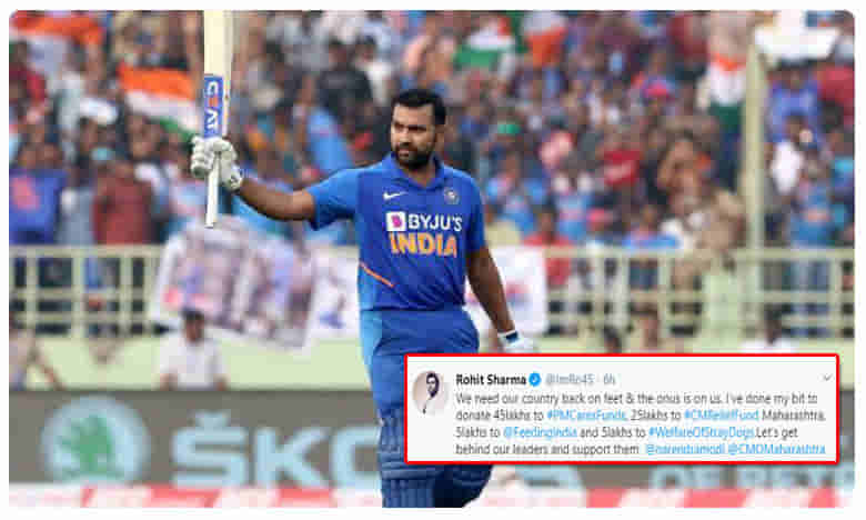 Covid-19: దేశంలో వేగంగా విస్తరిస్తున్న కరోనా వైరస్ ను అడ్డుకునేందుకు ప్రభుత్వాలు చేస్తున్న పోరాటానికి టీమిండియా ఓపెనర్ రోహిత్ శర్మ అండగా నిలిచాడు. కరోనాపై పోరుకు తన వంతు సాయంగా రూ. 80 లక్షల విరాళాన్ని అందజేశాడు. ప్రధాన మంత్రి సహాయ నిధి(పీఎం-కేర్స్)కు రూ.45లక్షలు, మహారాష్ట్ర సీఎం రిలీఫ్ ఫండ్ కు రూ.25లక్షలు, ఫీడింగ్ ఇండియాకు రూ. 5 లక్షలు, వీధి కుక్కలా సంరక్షణకు రూ. 5 లక్షల విరాళమిచ్చాడు.
