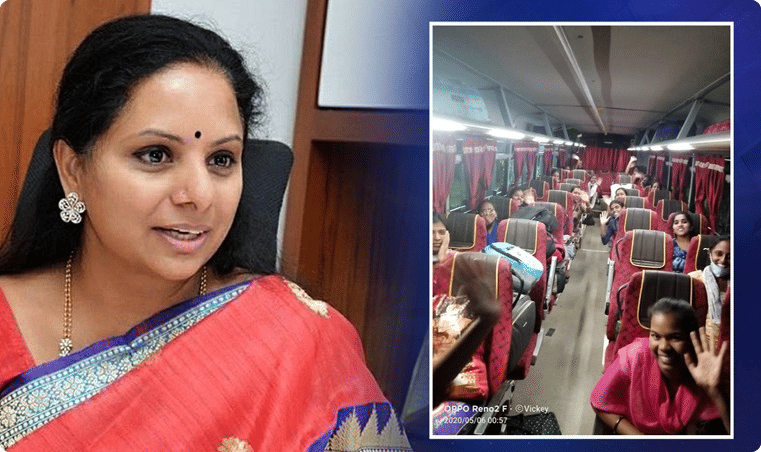 లాక్ డౌన్ కారణంగా మహారాష్ట్రలోని సోలాపూర్ లో చిక్కుకున్న 68 మంది తెలంగాణ యువతులు, మాజీ ఎంపీ కల్వకుంట్ల కవిత ప్రత్యేక చొరవతో వారి స్వస్థలాలకు చేరుకున్నారు. తెలంగాణ లోని వివిధ జిల్లాలకు చెందిన 68 మంది యువతులు లాక్ డౌన్ కారణంగా మహారాష్ట్రలోని సోలాపూర్ లో చిక్కుకుపోయారు. యువతులందరినీ అక్కడి ఒక ప్రైవేటు కాలేజీలో వసతి ఏర్పాటు చేశారు. అయితే 23 రోజులుగా ఇరుకు గదుల్లో ఎక్కువ మంది ఉండటం, కనీస సౌకర్యాలు కూడా లేకపోవడంతో యువతులు తీవ్ర ఇబ్బందులు పడాల్సి వచ్చింది.