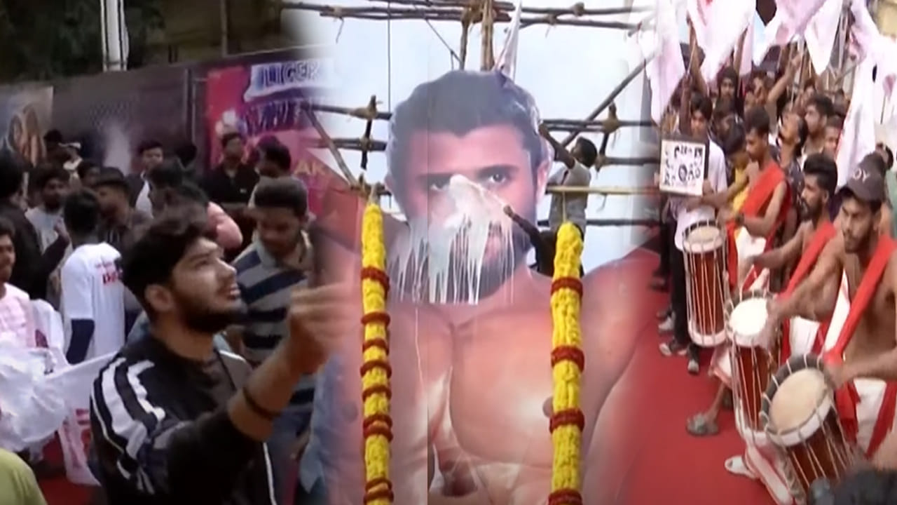 లైగర్ ట్రైలర్ లాంచ్ సందర్భంగా సుదర్శన్ థియేటర్ దగ్గర ఏర్పాటు చేసిన విజయ్ దేవరకొండ 75 అడుగుల కటౌట్ కు అభిమానులు పూలాభిషేకం, పాలాభిషేకం చేస్తున్నారు.