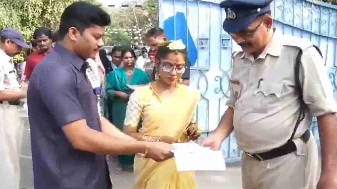 తిరుపతిలో జరుగుతున్న ఏపీపీఎస్సీ గ్రూప్-2 మెయిన్స్ పరీక్షల్లో ఆసక్తికరమైన దృశ్యం వెలుగు చూసింది. తిరుపతిలో 13 కేంద్రాల్లో జరుగుతున్న ఏపీపీఎస్సీ గ్రూప్ 2 మెయిన్స్ పరీక్షకు అధికారులు అన్ని ఏర్పాట్లు చేశారు. అయితే పరీక్షకు హాజరైన ఒక యువతి అందరినీ ఆశ్చర్య పరిచింది. ఏకంగా పట్టు బట్టలు, పెళ్లి కూతురుగా ముస్తాబై పరీక్ష రాయడానికి వచ్చింది. ఆమె చూసి అంతా షాక్ అయ్యారు.
