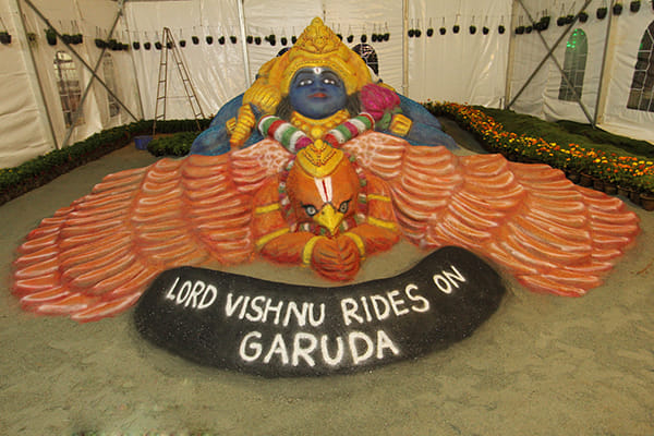 అదేవిధంగా, గరుడ గమన గోవిందా అనే పేరుతో బెంగళూరుకు చెందిన సోదరీమణులు కుమారి గౌరి, కుమారి నీలాంబిక చక్కటి సైకత శిల్పాన్ని రూపొందిస్తున్నారు. శ్రీ మహావిష్ణవు తనకిష్టమైన గరుడునిపై వస్తున్న విధంగా ఉన్న ఈ సైకత శిల్పం భక్తులకు భక్తిభావాన్ని పంచుతోంది. రెండు రోజుల్లో ఈ సైకత శిల్పం తయారీ పూర్తవుతుంది.