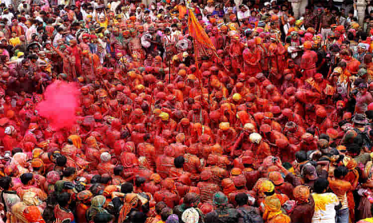 ఉత్తరప్రదేశ్లో హోలీ సంబరాలు అంబరాన్నంటుతున్నాయి. మార్చి 21న జరిగే హోలీకి నాలుగురోజుల ముందుగానే ఇక్కడ సంబరాలు మొదలవుతాయి. మధురలోని శ్రీరాధారాణి ఆలయంలో రంగుల పండుగను ఉత్సాహంగా జరురుపుకుంటున్నారు. వేలాదిమంది చిన్నాపెద్దా ఆడిపాడుతూ డప్పులు వాయిస్తూ ఒకరిపై ఒకరు రంగులు చల్లుకుని సెలబ్రేట్ చేసుకున్నారు. ఈ ఉత్సవంలో పాల్గొనేందుకు ప్రజలు దేశవ్యాప్తంగా తరలివస్తారు. బర్సానా హోలీగా పేరు తెచ్చుకున్న ఈ సంప్రదాయ వేడుకకు విదేశీయులు భారీగా తరలివస్తుంటారు. వీధులన్నీ రంగులమయమైపోతాయి. లడ్డూ, స్వీట్లు పంచుకుంటూ ద్యాన్సులు చేస్తూ హోలీ పందుగను పెద్దఎత్తున జరుపుకుంటారు.