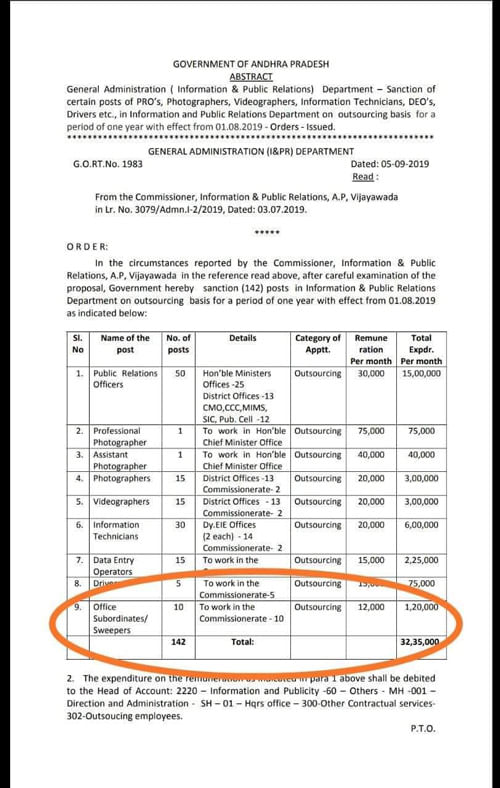 ఇది ఇలా ఉండగా ఏపీ ప్రభుత్వం తాజాగా విడుదల చేసిన ఓ నోటిఫికేషన్ జీవో ఫోటో ఇప్పుడు సోషల్ మీడియాలో వైరల్ అవుతోంది. అందులో స్వీపర్ ఉద్యోగానికి నెలకు రూ.12 వేలు చెల్లిస్తామని పేర్కొంది. అయితే స్వీపర్ చేసే పని కంటే గ్రామ వాలంటీర్లే ఎక్కువ కష్టపడాల్సి ఉంటుందని… అలాంటి వారికి కేవలం 5 వేలు ఇవ్వడం ఎక్కడి న్యాయమని కొందరు నెటిజన్లు ప్రశ్నిస్తున్నారు.