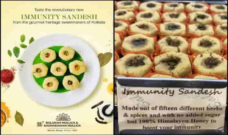 కోల్కతాలోని బలరామ్ ముల్లిక్, రాధారమన్ ముల్లిక్ అనే మిఠాయిల దుకాణందారులు ‘ఇమ్యూనిటీ సందేశ్’ స్వీట్ ను తయారు చేశారు. రోగనిరోధక శక్తిని పెంచే వివిధ మూలికలతో వీటిని తయారు చేశామని చెప్పుకొచ్చారు. పసుపు, లవంగాలు, యాలకలు, దాల్చిన చెక్క, కుంకుమ పువ్వు, కాలా జీరా, ములేథి, బిర్యానీ ఆకు, తేనె తదితర రకాల మూలికలతో ఈ స్వీట్స్ను తయారు చేసినట్లు దుకాణం నిర్వాహకులు తెలిపారు. కరోనా వైరస్కు వ్యాక్సిన్ ఇంకా రాలేదు. రోగనిరోధక శక్తిని పెంచుకోవడమే సరైన మార్గం. అందుకే ఆయుర్వేద నిపుణులను సంప్రదించి 15 రకాల మూలికలతో వీటిని తయారు చేశామని.. చక్కెర జత చేయకుండా కేవలం హిమాలయా తేనెతో మాత్రమే తయారు చేశామని మిఠాయివాలా చెప్పారు. ఒక్కో మిఠాయి ఖరీదు రూ.25 గా నిర్ణయించినట్లు దుకాణం యజమానులు తెలిపారు. ఈ మిఠాయిలకు స్థానికంగా మంచి డిమాండ్ ఉందని.. ప్రజలు వీటిని ఎంతో ఇష్టంగా అస్వాదిస్తున్నారని నిర్వాహకులు చెబుతున్నారు. అయితే వీటిని మాత్రం వైద్యులు అధికారికంగా ధృవీకరించాల్సివుంది.