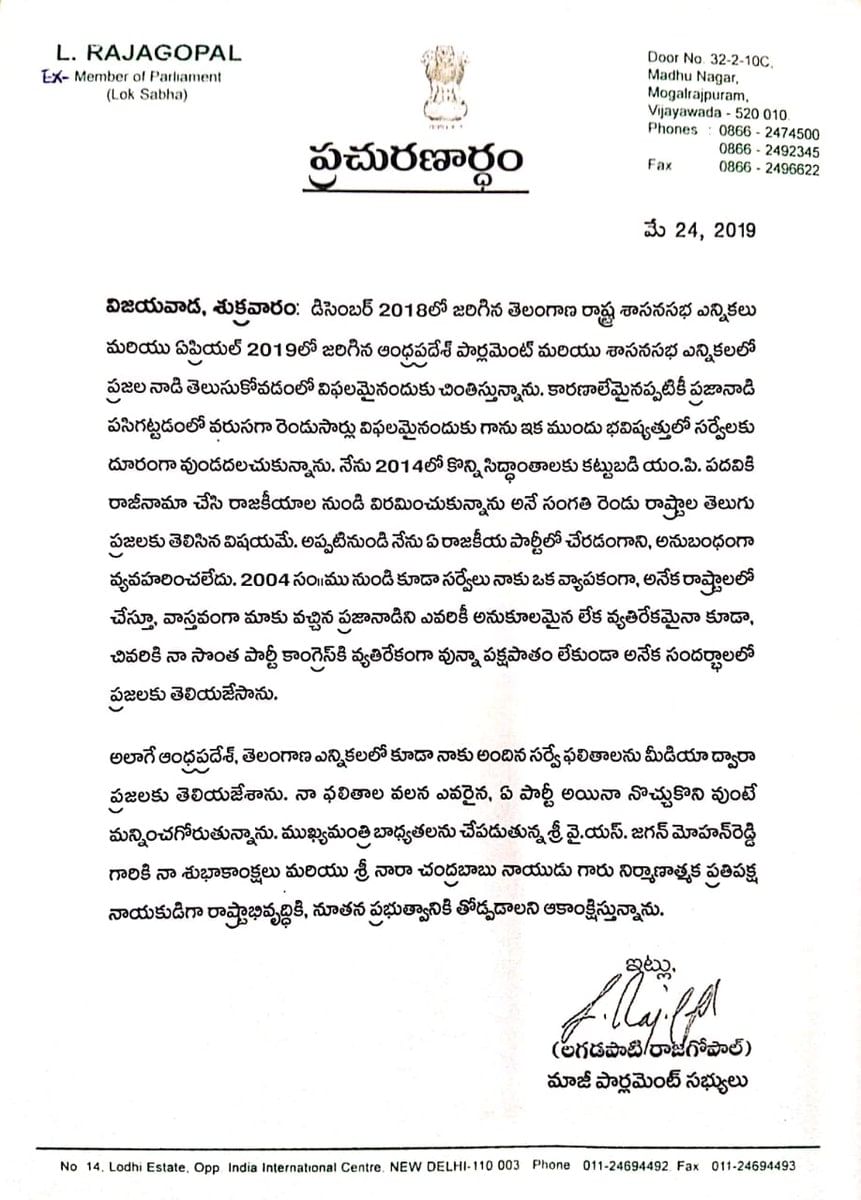 ‘ప్రజానాడి పసిగట్టడంలో రెండుసార్లు విఫలం అయినందుకు గాను ఇకముందు సర్వేలకు దూరంగా ఉండదలుచుకున్నాను.’ అని ఆ ప్రకటలో పేర్కొన్నారు. ఆర్జీ ఫ్లాష్ టీమ్ పేరుతో లగడపాటి రాజగోపాల్ నిర్వహించిన సర్వేలు.. అసలు ఫలితాలకు దగ్గరగా ఉండేవి. దీంతో లగడపాటి రాజగోపాల్ సర్వేలు అంటే క్రేజ్ ఉండేది. అయితే, 2018 తెలంగాణ అసెంబ్లీ ఫలితాల్లో ఆయన చెప్పిన లెక్కలు తారుమారు అయ్యాయి. తెలంగాణలో కాంగ్రెస్ – టీడీపీ మహాకూటమి ప్రభుత్వంలోకి వస్తుందని లగడపాటి చెప్పారు. అయితే, ఆఎన్నికల్లో టీఆర్ఎస్ ఘన విజయం సాధించింది. 117 సీట్లకు గాను 88 స్థానాల్లో విజయం సాధించింది. ఇక ఏపీ విషయంలోనూ సేమ్ సీన్ రిపీట్ అయ్యింది. లగడపాటి సర్వే అట్టర్ ప్లాప్ అయ్యింది. టీడీపీకి 100కు ఒక పది సీట్లకు అటూ, ఇటూగా వస్తాయని, వైసీపీకి 70 సీట్లు వరకు రావొచ్చని అంచనా వేశారు. కానీ, వైసీపీ సంచలన విజయం నమోదు చేసింది. 151 స్థానాల్లో విజయ ఢంకా మోగించింది. టీడీపీకి 23, జనసేనకు ఒక సీటు వచ్చాయి. వరుసగా ఆయన సర్వేలు విఫలం కావడంతో ఉభయ తెలుగు రాష్ట్రాల్లో తీవ్రమైన విమర్శలు వచ్చాయి. దీంతో ఇకపై తాను సర్వేలకు దూరంగా ఉంటానని ప్రకటించారు.