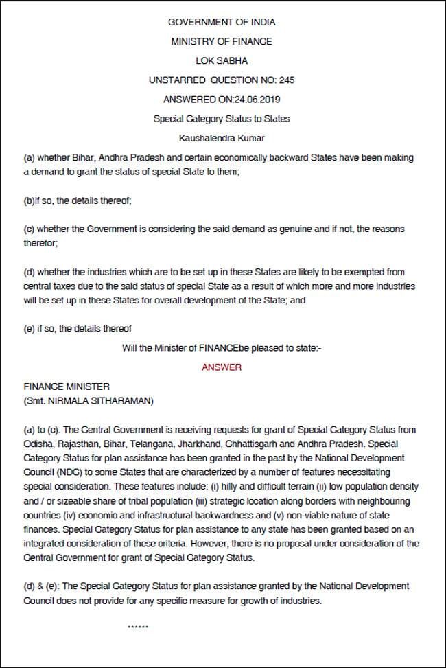 మొన్న జరిగిన నీతి ఆయోగ్ సమావేశంలో కూడా జగన్ ప్రత్యేక హోదా ఇవ్వాల్సిన ఆవశ్యకత గురించి కేంద్రానికి నివేదిక ఇచ్చారు. తాజాగా జరిగిన ప్రధాని అఖిలపక్ష సమావేశానికి వెళ్ళినప్పుడు కూడా జగన్ హోదా గురించి బలంగా ప్రస్తావించారు. అయితే దీనిపై మోదీ పెద్దగా ఆసక్తి చూపలేదు. ఇక ఈ హోదా విషయంపై కేంద్ర నిర్ణయం ఏంటనేది ఆర్ధికమంత్రి నిర్మలా సీతారామన్ మాటల్లో తేట తెల్లమైంది. నిన్న పార్లమెంట్లో ఆమె మాట్లాడుతూ ‘ ఏపీ, తెలంగాణతో పాటు బీహార్, జార్ఖండ్, చత్తీస్గఢ్, ఒడిశా, రాజస్థాన్ రాష్ట్రాల నుంచి ప్రత్యేక హోదా డిమాండ్లు వచ్చాయని, కానీ ఏ రాష్ట్రానికి ప్రత్యేక హోదా ఇచ్చే ప్రతిపాదనలు కేంద్ర పరిశీలనలో లేవని స్పష్టం చేశారు. లోకసభలో బీహార్ ఎంపీ కౌసలేంద్ర కుమార్ ప్రత్యేక హోదాపై అడిగిన ప్రశ్నకు ఆమె ఈ మేరకు లిఖిత పూర్వకంగా సమాధానమిచ్చారు.