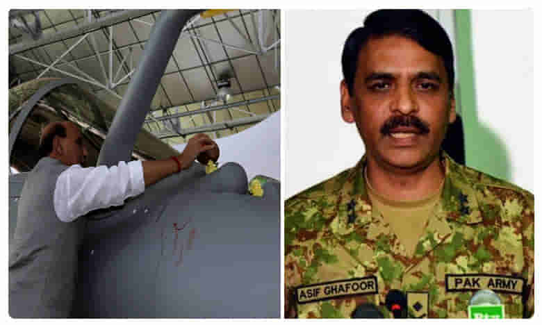 రాఫెల్ యుద్ధ విమానాలకు కేంద్ర రక్షణ శాఖ మంత్రి రాజ్నాథ్ సింగ్ చేసిన శస్త్రపూజపై పాక్ ఆర్మీ కూడా స్పందించింది. ఓ వైపు దేశంలో ప్రతిపక్షాల నుంచి భిన్నస్వరాలు వస్తున్న సమయంలో.. పాక్ ఆర్మీ చేసిన వ్యాఖ్యలు ఆసక్తిగా మారాయి. రాఫెల్ యుద్ధ విమానానికి రాజ్నాథ్ హిందూ సంప్రదాయ ప్రకారం పూజలు చేశారు. అయితే ఎవరి మతాచారం ప్రకారం వారు పూజలు చేయడంలో తప్పలేదని.. అంతేకాదు మత విశ్వాసాలను గౌరవించాలని పాక్ ఆర్మీ ప్రతినిధి ఆసిఫ్ గఫూర్ పేర్కొన్నారు. ఫ్రాన్స్లో రాఫెల్కు ఆయుధ పూజ నిర్వహించడంపై ఆయన ట్విటర్ వేదికగా స్పందించారు.