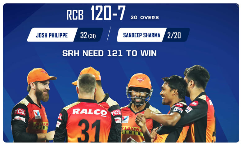 రాయల్ ఛాలెంజర్స్ బెంగళూరుతో కీలక మ్యాచ్లో సన్రైజర్స్ హైదరాబాద్ అదరగొట్టారు. సందీప్ శర్మ(2/20), జేసన్ హోల్డర్(2/27) ధాటికి బెంగళూరు నిర్ణీత 20 ఓవర్లలో 7వికెట్లకు 120 పరుగుకే పరిమితమైంది.
