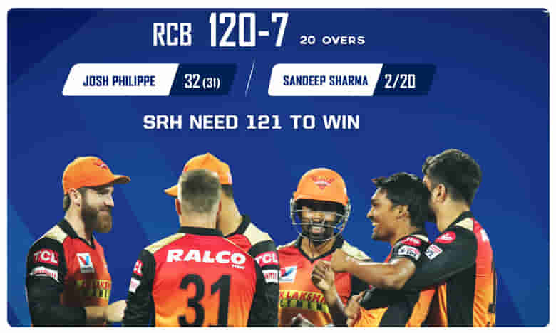 రాయల్ ఛాలెంజర్స్ బెంగళూరుతో కీలక మ్యాచ్లో సన్రైజర్స్ హైదరాబాద్ అదరగొట్టారు. సందీప్ శర్మ(2/20), జేసన్ హోల్డర్(2/27) ధాటికి బెంగళూరు నిర్ణీత 20 ఓవర్లలో 7వికెట్లకు 120 పరుగుకే పరిమితమైంది. ఓపెనర్ జోష్ ఫిలిప్(32: 31 బంతుల్లో 4ఫోర్లు) ఒక్కడే కాస్త ఫర్వాలేదనిపించారు. ఏబీ డివిలియర్స్(24), వాషింగ్టన్ సుందర్(21) జట్టును ఆదుకునే ప్రయత్నం చేశారు. టాస్ గెలిచిన సన్రైజర్స్ ఫీల్డింగ్ ఎంచుకుంది. దీంతో ముందుగా బ్యాటింగ్ చేసిన బెంగళూరు ఏ దశలోనూ ఆకట్టుకోలేకపోయింది. ఆరంభం నుంచే హైదరాబాద్ బౌలర్లు ఆధిపత్యం ప్రదర్శించారు. పరుగులు చేసేందుకు బ్యాట్స్మెన్ తెగ కష్టపడ్డారు. ఫామ్లో ఉన్న ఓపెనర్ దేవదత్ పడిక్కల్(5), విరాట్ కోహ్లీ(7) విఫలమయ్యారు. ఇక డెత్ ఓవర్లలో కూడా బెంగళూరు సత్తా చాటలేకపోయింది. గుర్కీరత్ సింగ్ ఆఖరి వరకు క్రీజులో ఉన్నా 24 బంతుల్లో కేవలం 15 రన్సే చేశాడు. నటరాజన్(1/11) బెంగళూరును బాగా ఇబ్బంది పెట్టాడు. నదీమ్(1/35), రషీద్ ఖాన్(1/24) కూడా పదునైన బంతులతో ప్రత్యర్థి బ్యాట్స్మెన్ను కట్టడి చేశారు.