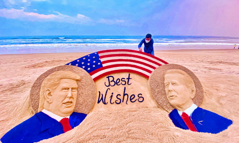 అమెరికా అధ్యక్ష ఎన్నికలపై సైకత శిల్పం