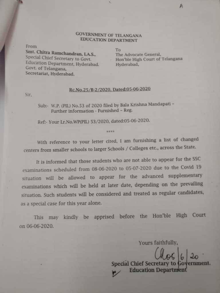 తెలంగాణ ప్రభుత్వం పది పరీక్షలపై మరో కీలక నిర్ణయం తీసుకుంది. పదో తరగతి సప్లిమెంటరీ ఎగ్జామ్స్లో ఉత్తీర్ణులైన విద్యార్థులను రెగ్యులర్గా గుర్తించాలని ప్రభుత్వం నిర్ణయించింది. ఇక ఈ ప్రభుత్వ నిర్ణయాన్ని హైకోర్టుకు ఏజీ ప్రసాద్ నివేదించారు. కరోనా వైరస్ కారణంగా ఈ నెల 8వ తేదీ నుంచి వచ్చే నెల 5వ తేదీ వరకు జరగనున్న పదో తరగతి పరీక్షలకు హాజరు కాలేకపోయిన విద్యార్థులు సప్లిమెంటరీ పరీక్ష రాయొచ్చునంది. అప్పుడు ఆ పరీక్షల్లో ఉత్తీర్ణత సాధించిన వారిని రెగ్యులర్ విద్యార్థులుగా గుర్తిస్తామని పేర్కొంటూ తెలంగాణ ప్రభుత్వం తాజాగా జీవో విడుదల చేసింది.
