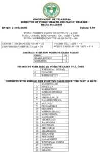 మరోవైపు ఇవాళ 23 మంది కరోనా బాధితులు డిశ్చార్జ్ కాగా.. 26 కొత్త కేసులు జీహెచ్ఎంసీ పరిధిలో, ఇద్దరు రంగారెడ్డి జిల్లాలో నమోదైతే.. మిగిలిన 10 ఇతర ప్రాంతాల నుంచి వచ్చినవారివిగా తేలింది. ఇప్పటివరకు 99 మంది వలస కూలీలకు కరోనా సోకింది. ఇక జిల్లాల వారీగా చూసుకుంటే.. వరంగల్ రూరల్, యాదాద్రి భువనగిరి, గద్వాల వనపర్తి జిల్లాల్లో ఇప్పటి వరకు ఒక్క కరోనా కేసు కూడా నమోదు కాలేదని రాష్ట్ర వైద్య ఆరోగ్యశాఖ ఓ ప్రకటనలో తెలిపింది.