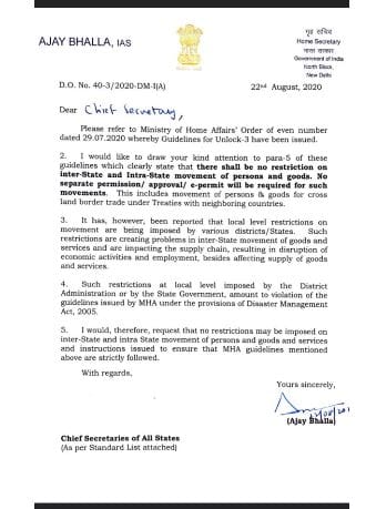 అన్లాక్ 3.0 నేపథ్యంలో అంతర్రాష్ట్ర ప్రయాణాలపై పూర్తిగా ఆంక్షలు ఎత్తి వేయాలని కేంద్ర ప్రభుత్వం స్పష్టం చేసింది. ఈ మేరకు అన్ని రాష్ట్రాల ప్రధాన కార్యదర్శలకు కేంద్ర హోంశాఖ కార్యదర్శి అజయ్ భల్లా లేఖ రాశారు.
