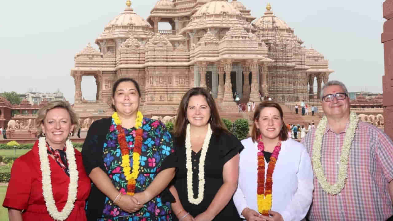 దేశ రాజధాని ఢిల్లీలోని స్వామినారాయణ అక్షరధామ్ ఆలయాన్ని ఆస్ట్రేలియాకు చెందిన పార్లమెంట్ సభ్యుల ప్రతినిధి బృందం సందర్శించింది. ఈ సందర్భంగా.. ఆస్ట్రేలియా ఎంపీలు స్వామి వారి ప్రత్యేక పూజల్లో పాల్గొన్నారు. అక్షరధామ్ మందిరం నిర్మాణం – అద్భుతమైన కట్టడం చూసి మంత్రముగ్ధులయ్యారు. భారతదేశ పర్యటనలో భాగంగా ఆస్ట్రేలియాలోని విక్టోరియాకు చెందిన పార్లమెంటు సభ్యుల ప్రతినిధి బృందం జూన్ 1న న్యూఢిల్లీకి చేరుకుంది. ఈ పర్యటనలో భాగంగా.. విక్టోరియా ఎంపీలు లీ టార్లామిస్, పౌలిన్ రిచర్డ్స్, బెలిండా విల్సన్, షీనా వాట్, జూలియానా అడిసన్ న్యూ ఢిల్లీలోని స్వామినారాయణ్ అక్షరధామ్ ఆలయాన్ని సందర్శించారు. ఎంపీలను ఆలయ ప్రతినిధులు సాంప్రదాయకంగా స్వాగతం పలికారు.. అనంతరం మందిరంలో ప్రత్యేక పూజా క్రతువుల్లో పాల్గొన్నారు. సంక్లిష్టమైన నిర్మాణాన్ని చూసి వారంతా ఆశ్చర్యపోవడంతోపాటు.. మంత్రముగ్ధులయ్యామంటూ కితాబిచ్చారు.