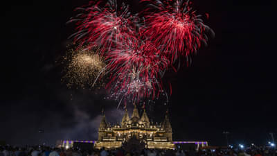 Swaminarayan Temple: స్వామినారాయణ్ ఆలయ ప్రాణ ప్రతిష్ట వేడుకలు.. బాణాసంచా ప్రదర్శనలతో వెలిగిపోయిన ప్రాంగణం