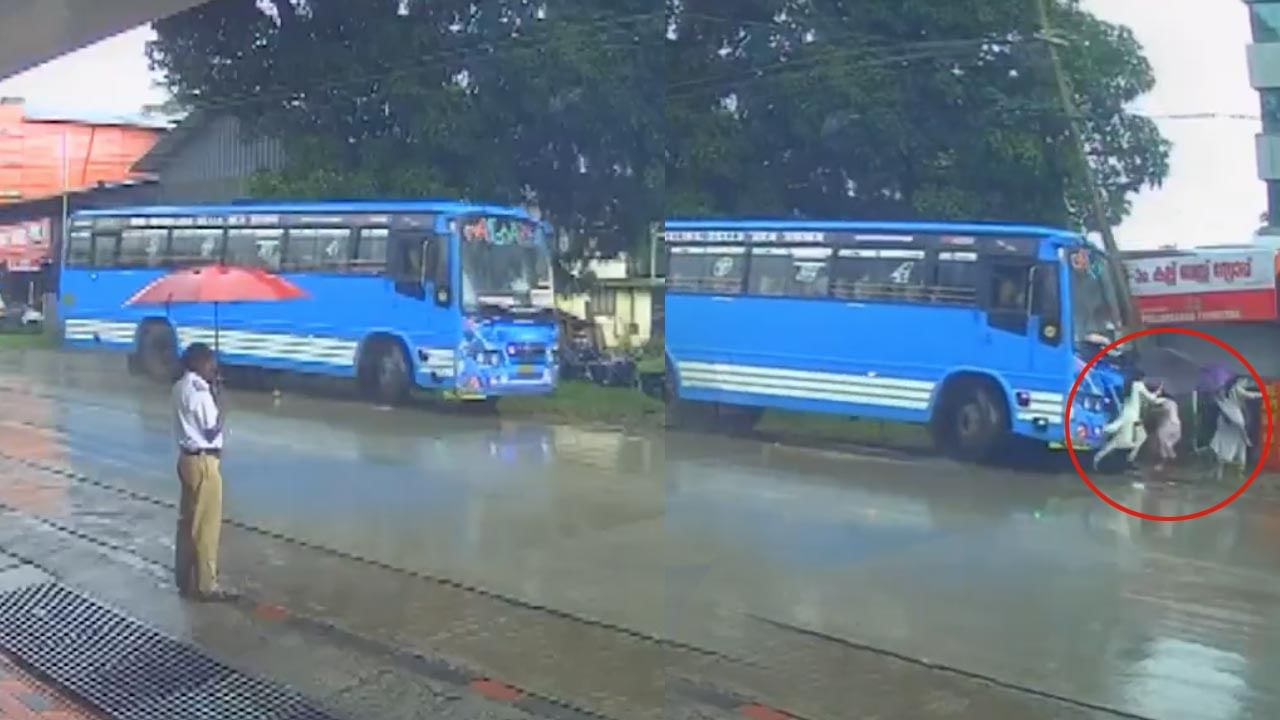 బస్టాప్లో బస్సులోకం వెయిట్ చేస్తున్న మహిళలపైకి బస్సు దూసుకొచ్చిన ఘటన కేరళ రాష్ట్రంలో శనివారం వెలుగు చూసింది. ఇందుకు సంబంధించిన ఓ వీడియో ప్రస్తుతం సోషల్ మీడియాలో వైరల్గా మారింది. వైరల్ అవుతున్న వీడియో ప్రకారం.. కేరళ రాష్ట్రం త్రిసూర్ లోని చోవూర్ బస్టాండ్ లో ముగ్గురు మహిళలు బస్సు కోసం వేచి ఉన్నారు. వర్షం పడుతుండడంతో గొడుగులు పట్టుకొని నిల్చున్నారు. అయితే ఇంతలో అటు నుంచి వేగంగా వచ్చిన ఓ ఆర్టీసీ బస్సు అదుపుతప్పి బస్టాండ్ ఎదురుగ నిలబడి ఉన్న మహిళలపైకి దూసుకొచ్చింది.