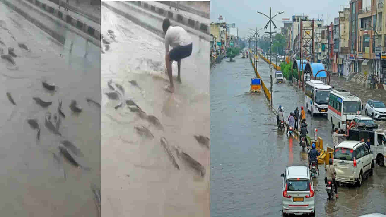 గత రెండు రోజులుగా రాజస్థాన్లో కుండపోతగా వర్షాలు కురుస్తున్న సంగతి తెలిసిందే. ఈ క్రమంలో నాగౌర్ జిల్లాలోని పలు ప్రాంతాలు, గ్రామాలు జలమయమయ్యాయి. నదులు, డ్రైనేజీలు, ఆనకట్టలు పొంగిపొర్లడంతో లోతట్టు ప్రాంతాలన్నీ మునిగిపోయాయి. భారీ వర్షాల దాటికి అక్కడ లంపోలై చెరువు పొంగిపొర్లింది. అందులోని నీరు రోడ్డపైకి రావడంతో చెరువులోని పెద్ద పెద్ద చేపలు రోడ్లపై భారీ సంఖ్యలో ఈదుతూ కనిపించాయి. దీంతో స్థానికులు వాటిని పట్టుకునేందుక రోడ్లపైకి వచ్చారు. ఇందుకు సంబంధించిన వీడియో క్లిప్ ప్రస్తుతం సోషల్ మీడియాలో వైరల్గా మారింది.