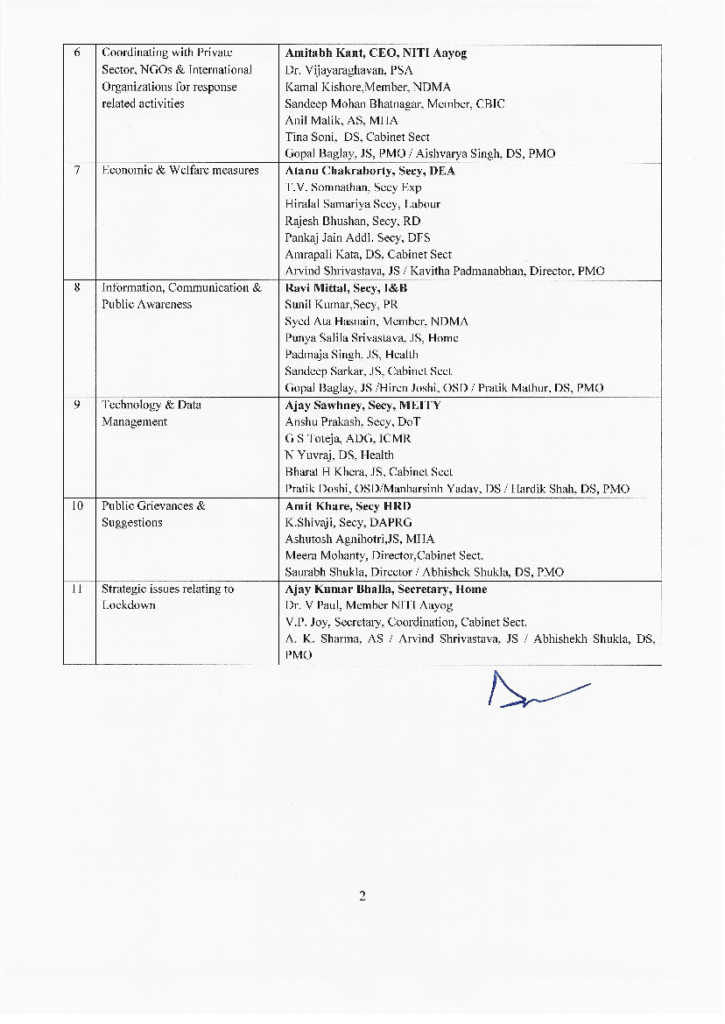 ఆర్థిక, వైద్య ఆరోగ్యరంగాలు సహా మొత్తం పదకొండు అంశాలలో తక్షణం తీసుకోవాల్సిన పరిస్థితులను అధ్యయనం చేసి, సరైన సిఫారసులను చేసేందుకు ఏకంగా పదకొండు కమిటీలను మోదీ నియమించారు. వాటన్నింటికీ ప్రధాన మంత్రి ముఖ్య కార్యదర్శి పీ.కే.మిశ్రా సారథ్యం వహిస్తారు. ఈ పదకొండు కమిటీలలో తొమ్మిదింటికి కార్యదర్శి స్థాయి అధికారి సారథ్యం వహిస్తుండగా.. ఒకదానికి నీతి ఆయోగ్ సభ్యుడు, మరొక దానికి నీతి ఆయోగ్ సీఈవో సారథ్యం వహిస్తారు. దేశం యావత్తు సడన్గా పాండామిక్ థ్రెట్లోకి వెళ్ళడంతో ఫ్యూచర్లో ఇలాంటి పరిణామాలు తలెత్తితే.. ఎదుర్కోవడానికి తగిన విధంగా చర్యలు తీసుకునే విషయంపై ఓ కమిటీని ప్రత్యేకంగా నియమించినట్లు తెలుస్తోంది.