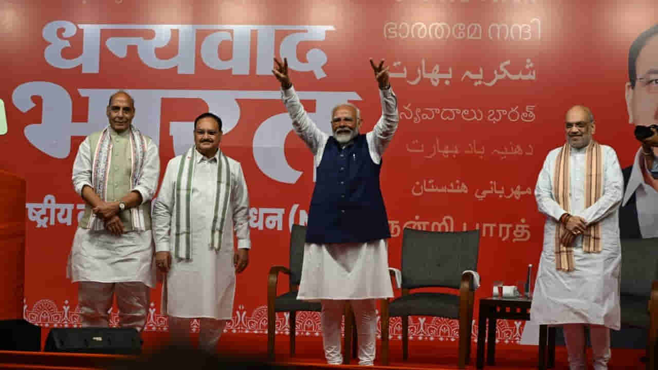 ఎన్డీయే మూడోసారి ప్రభుత్వాన్ని ఏర్పాటు చేస్తున్న నేపథ్యంలో మంగళవారం బీజేపీ ప్రధాన కార్యాలయంలో జరిగిన సంబరాల్లో ప్రధాన మంత్రి నరేంద్ర మోదీ పాల్గొన్నారు. భారత్ మాతాకీ జై, జై జగన్నాథ్ అంటూ ప్రసంగాన్ని ప్రారంభించిన ఆయన- ఈ ఆశీర్వాదానికి దేశ ప్రజలందరికీ రుణపడి ఉంటానన్నారు. ఈ పవిత్రమైన రోజున, NDA వరుసగా మూడోసారి ప్రభుత్వాన్ని ఏర్పాటు చేయడం ఖాయమైపోయిందన్నారు.