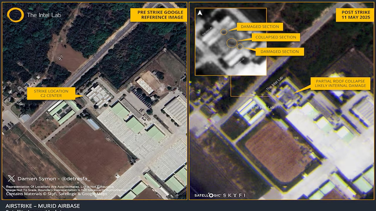 This report spotlights damage at Pakistan’s Murid Airbase – the Indian Air Force strike has caused structural damage to a Command & Control building, a section of the roof has collapsed as well, likely causing internal damage @TheIntelLab #Skyfi pic.twitter.com/k7O4FO0tKS