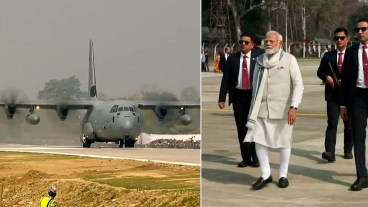 #WATCH | Assam witnesses a historic moment as Prime Minister Narendra Modi lands at the Emergency Landing Facility (ELF) on Moran Bypass in Dibrugarh. Here, he will witness the aerial display of fighters, transports and helicopters. The ELF is the first of its kind in Northeast… pic.twitter.com/DOp6lNqAXP