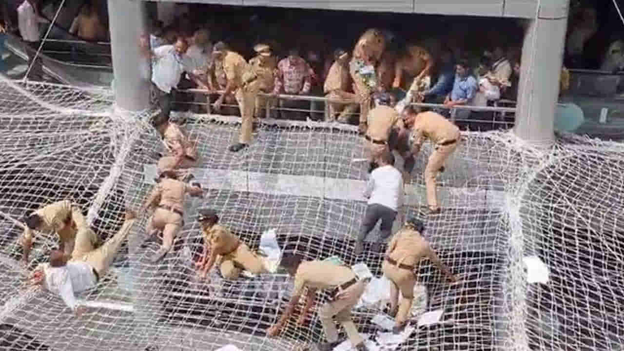 #WATCH | Farmers inside the Mantralaya building protesting against the Maharashtra govt demanding proper compensation for their land jump on protective net placed on the first floor of the building in Mumbai; police action underway