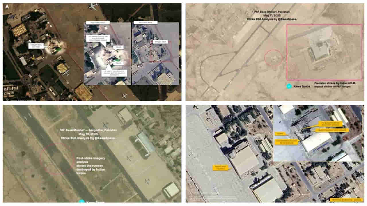 భారత ప్రైవేట్ సంస్థ KAWASPACE, చైనా కంపెనీ MizhaVision నుండి వచ్చిన హై-రిజల్యూషన్ ఉపగ్రహ చిత్రాలు భారత దాడి తర్వాత జరిగిన పరిణామాలను గ్రాఫికల్గా వివరిస్తున్నాయి. ఈ దాడులు ఖచ్చితమైన ఖచ్చితత్వాన్ని సాధించడానికి గాలి నుండి ప్రయోగించిన క్రూయిజ్ క్షిపణులను (ALCM), బహుశా బ్రహ్మోస్ను ఉపయోగించుకున్నాయని భావిస్తున్నారు. PAF మౌలిక సదుపాయాలకు తీవ్ర నష్టం వాటిల్లిందని ఆధారాలు వెల్లడిస్తున్నాయి:
