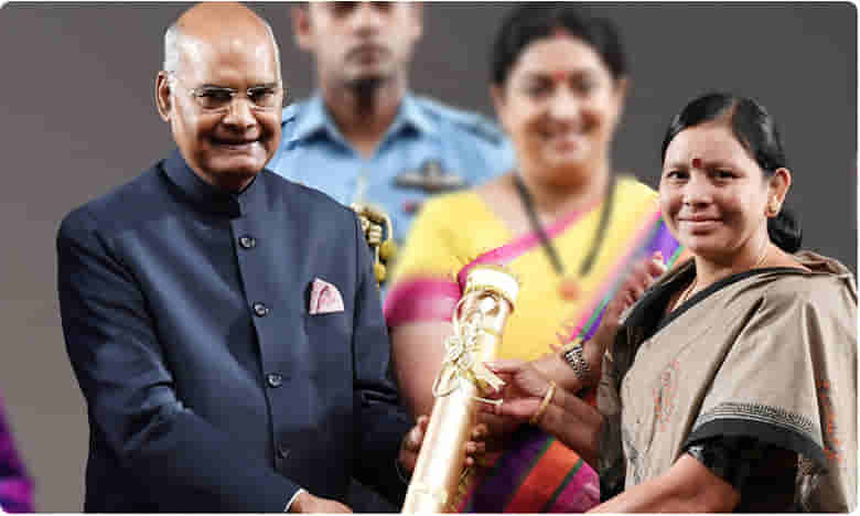 President Kovind presented the Nari Shakti Puraskar to Padala Bhudevi from Srikakulam, Andhra Pradesh. She has been working for the development of tribal women, widows and Podu lands through a community based organization Chinnai Adhivasi Vikas Society. pic.twitter.com/NoYxfxyrJa