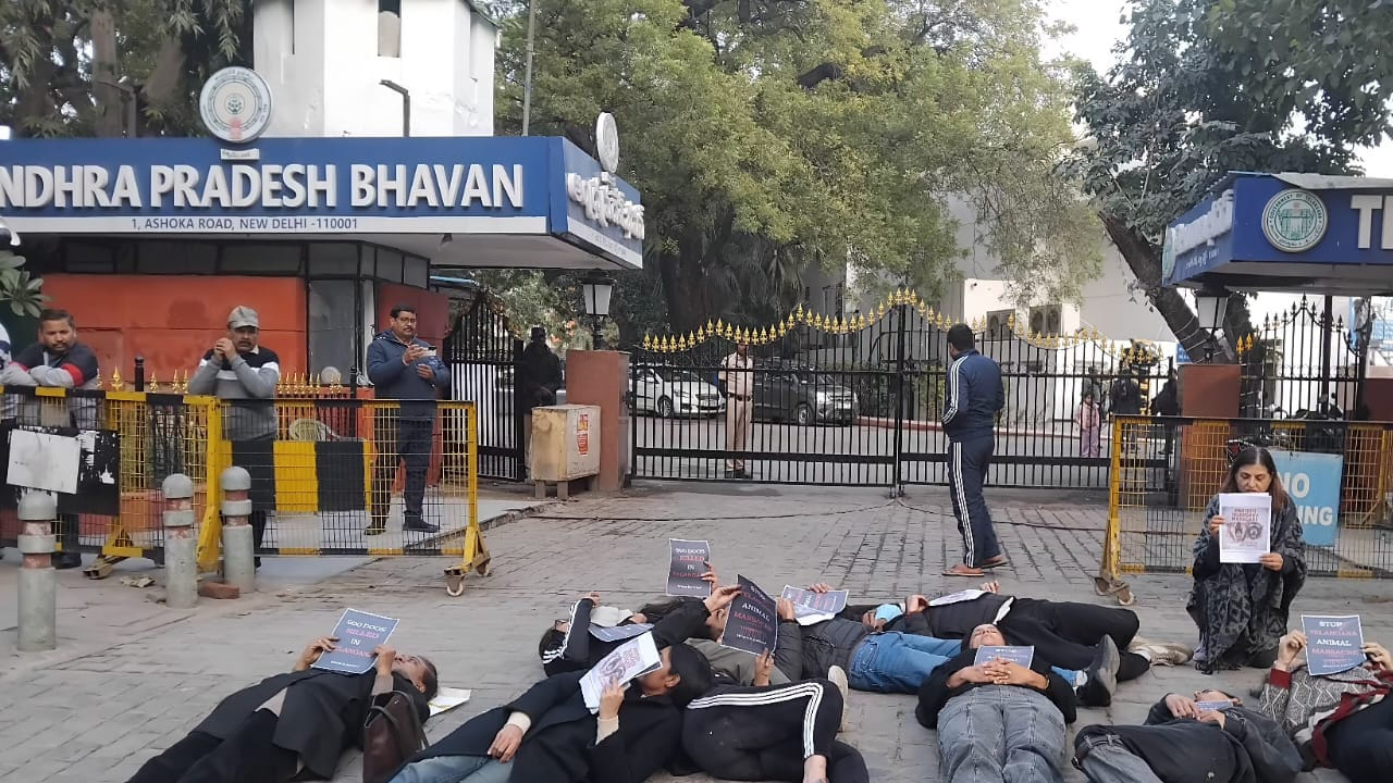ఢిల్లీ తెలంగాణ భవన్ ఎదుట జంతు ప్రేమికుల ఆందోళన..రోడ్డుపై పడుకుని నిరసన