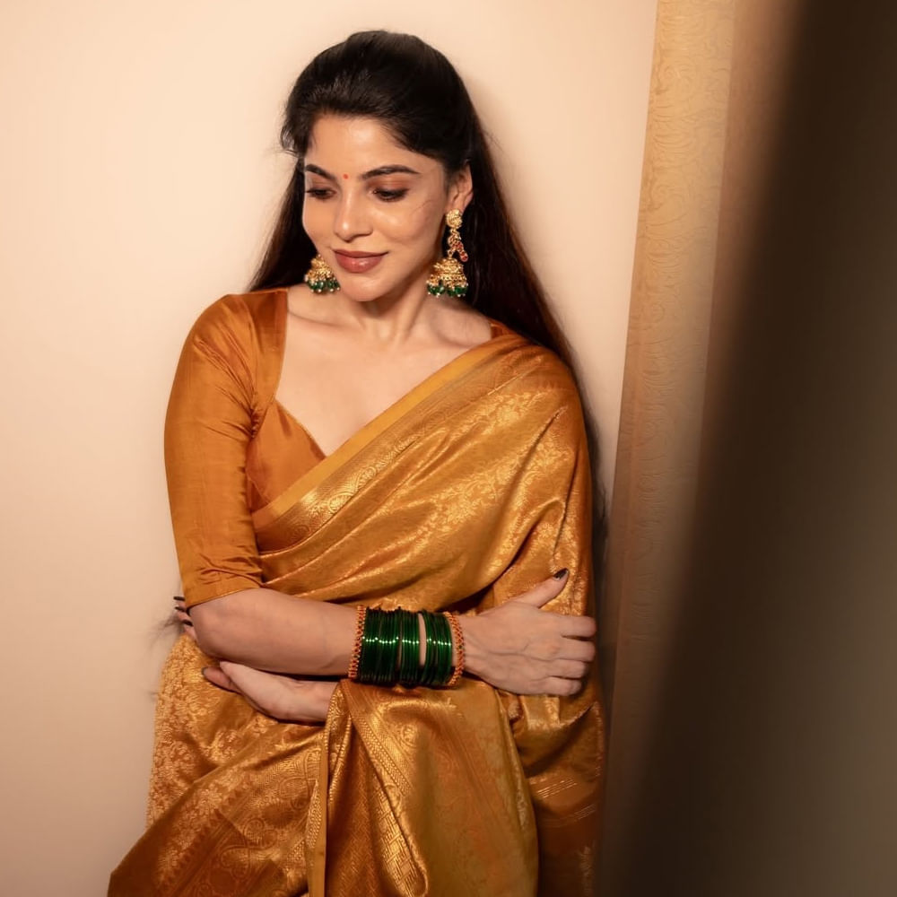- Telugu News Photo Gallery Cinema photos Actress Divya Bharathi Stunning Golden Saree Photos Goes Viral
