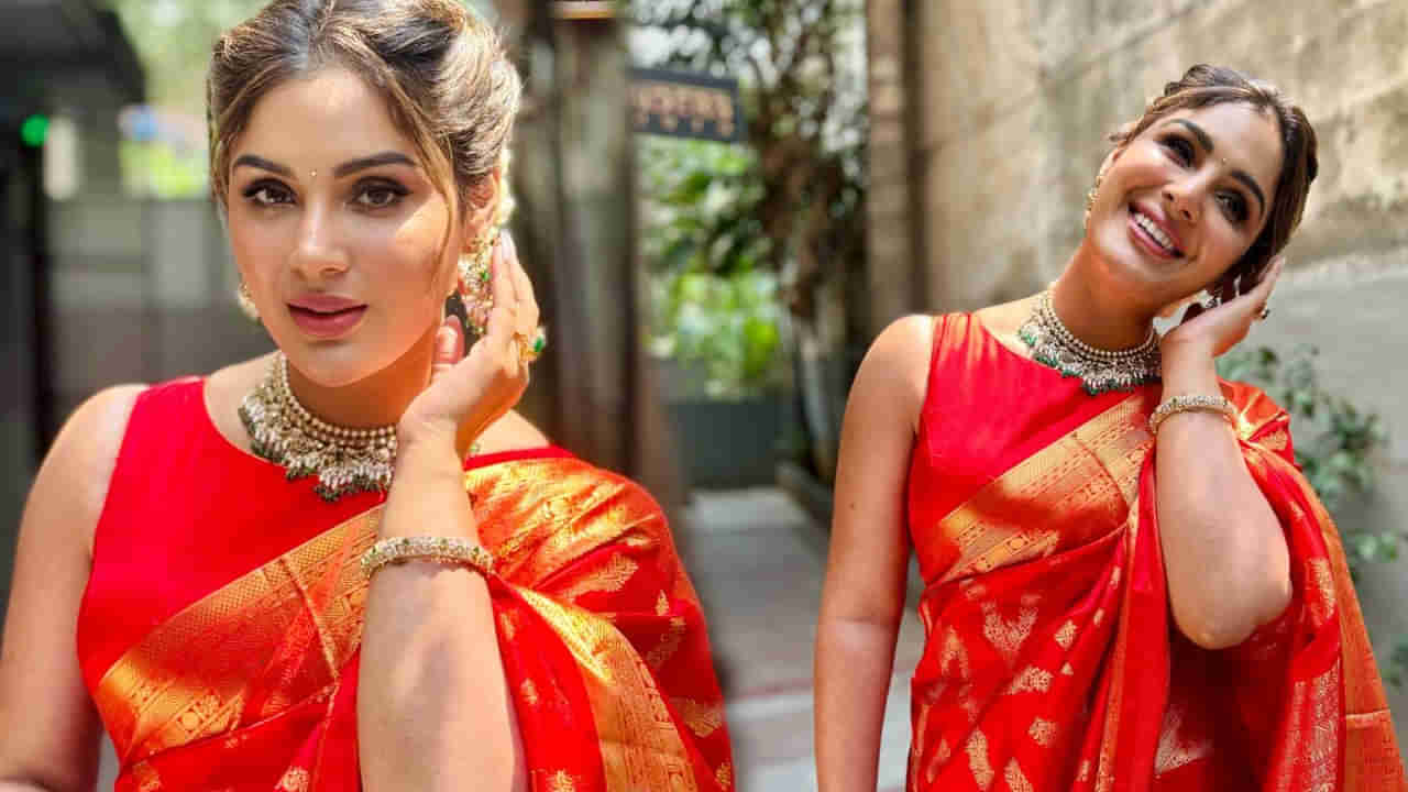 ఇక తాజాగా ఈ అమ్మడు రెడ్ కలర్ చీరలో దర్శనం ఇచ్చింది. స్లీవ్ లెస్ బ్లౌస్ ధరించి, బంగారు వర్ణంతో కూడిన ఎరుపు రంగు చీరలో అందాల మద్దుగుమ్మగా అందంగా కనిపించింది.