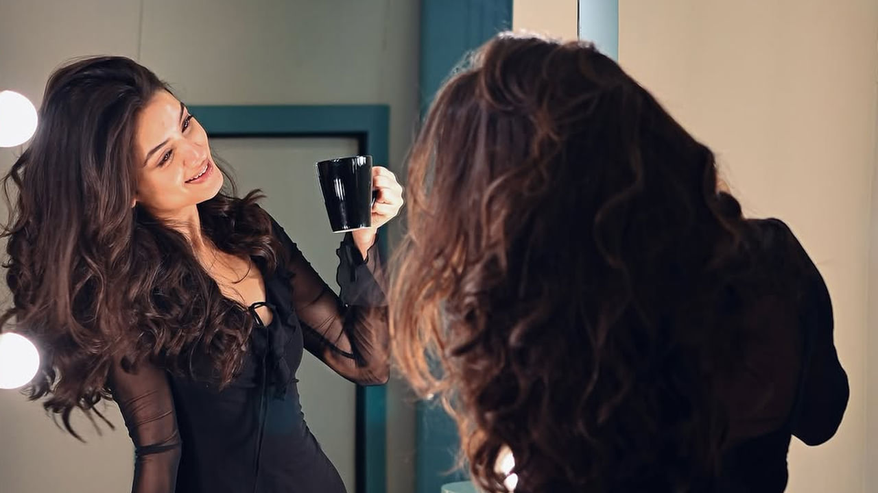 తాజాగా ఈ చిన్నది మిర్రర్ ముందు బ్లాక్ అండ్ డ్రెస్ లో కప్ చేతిలో పట్టుకొని ఫొటోలకు ఫోజులిచ్చింది. అంతే కాకుండా కైపెక్కిచ్చే విధంగా చూస్తూ అందరినీ ఆకట్టుకుంటుంది. ప్రస్తుతం ఈ ఫొటోస్ నెట్టింట తెగ వైరల్ అవుతున్నాయి.