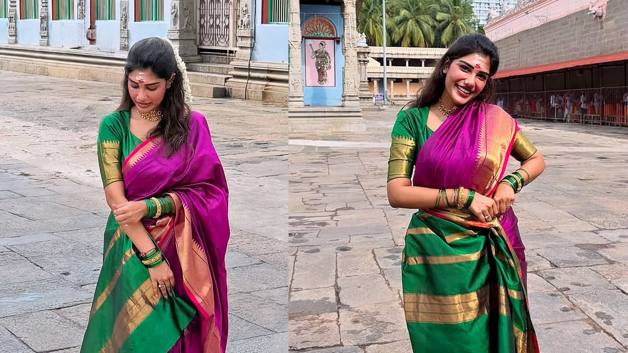 ఇక ఎప్పుడూ పార్టీలు, బీచ్లో దిగిన గ్లామర్ ఫొటోస్ షేర్ చేసే ఈ చిన్నది, తాజాగా గుడిలో సంప్రదాయ పద్ధతిలో రెడీ అయిపో ఫొటోస్ షేర్ చేసింది. అందులో ఈ అమ్మడు అందానికి ప్రతి ఒక్కరూ ఫిదా అయిపోతున్నారు.