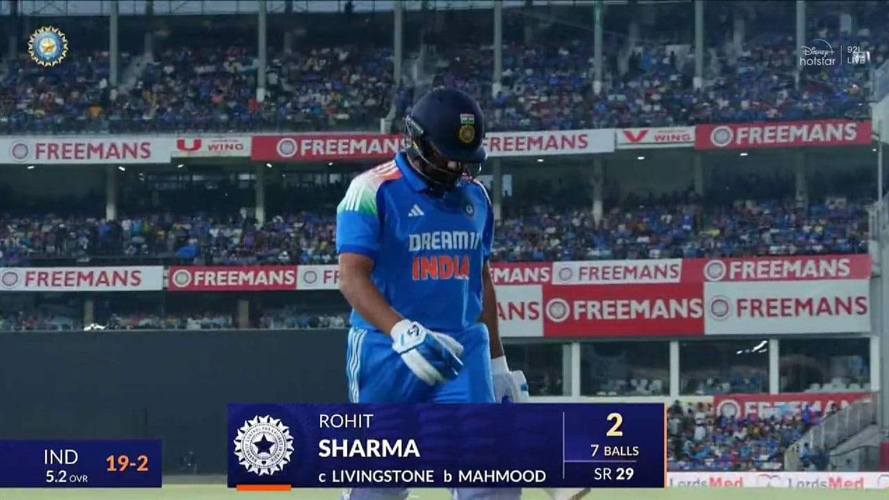 ఆరో ఓవర్లోనే భారత్ రెండో వికెట్ కోల్పోయి పీకల్లోతు కష్టాల్లో మునిగింది. కెప్టెన్ రోహిత్ శర్మ 7 బంతుల్లో 2 పరుగులు చేసిన తర్వాత క్యాచ్ అవుట్ అయ్యాడు. సాకిబ్ మహ్మద్ బౌలింగ్లో మిడ్-ఆన్లో లియామ్ లివింగ్స్టోన్ అద్భుత క్యాచ్తో హిట్ మ్యాన్ ఎటువంటి మెరుపులు లేకుండా పెవిలియన్ చేరాడు.